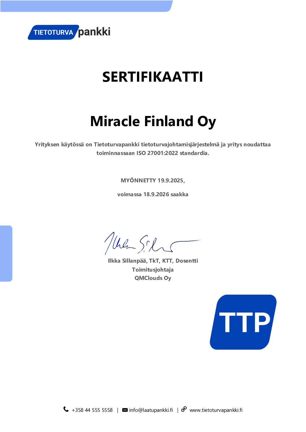 We are happy to share that our company has received the ISO/IEC 27001:2022 certificate on September 19, 2025. With the help of the Tietoturvapankki information security management system, we make sure our data security is strong and up to international standards.
