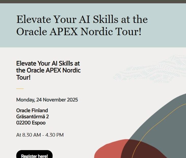 Oracle APEX Nordic Tour comes to Espoo on 24 November 2025. Join us for a day of APEX updates, demos, and practical insights on how to apply AI in app development . Full agenda and registration here: https://eventreg.oracle.com/profile/web/index.cfm?PKwebID=0x938240abcd&source=CORP250904P00002:se:ip:ie:pt:::SEO400419885&evite=CORP250904P00002:se:ip:ie:pt:::SEO400419885CTA1